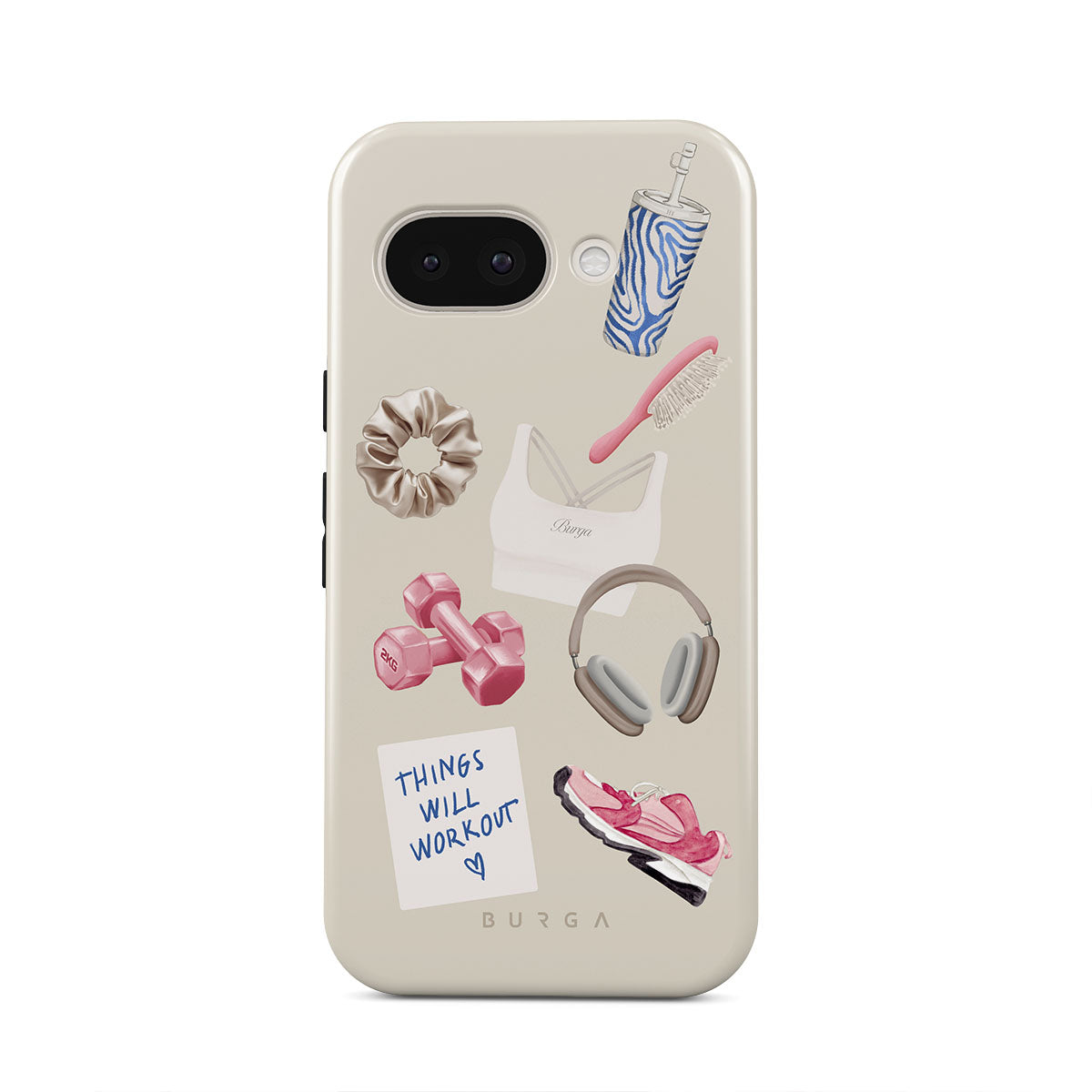 This design features: dumbbells, headphones, tumbler, hairbrush, pink trainers, sports bra, crunchie, "Things Will Work Out" sticky note