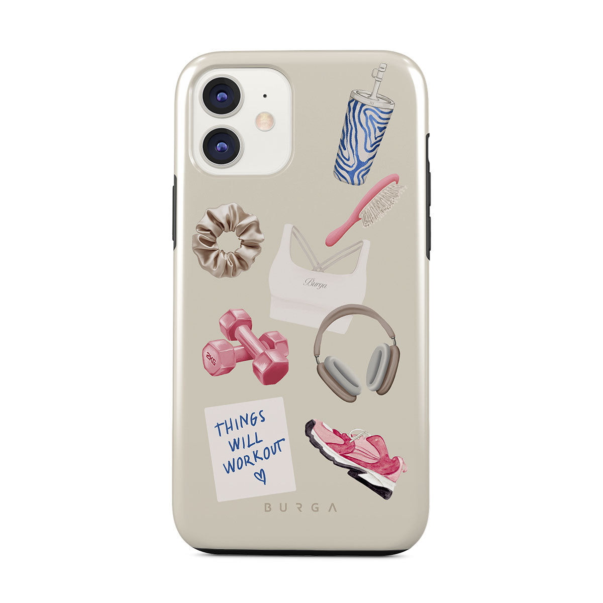 This design features: dumbbells, headphones, tumbler, hairbrush, pink trainers, sports bra, crunchie, "Things Will Work Out" sticky note