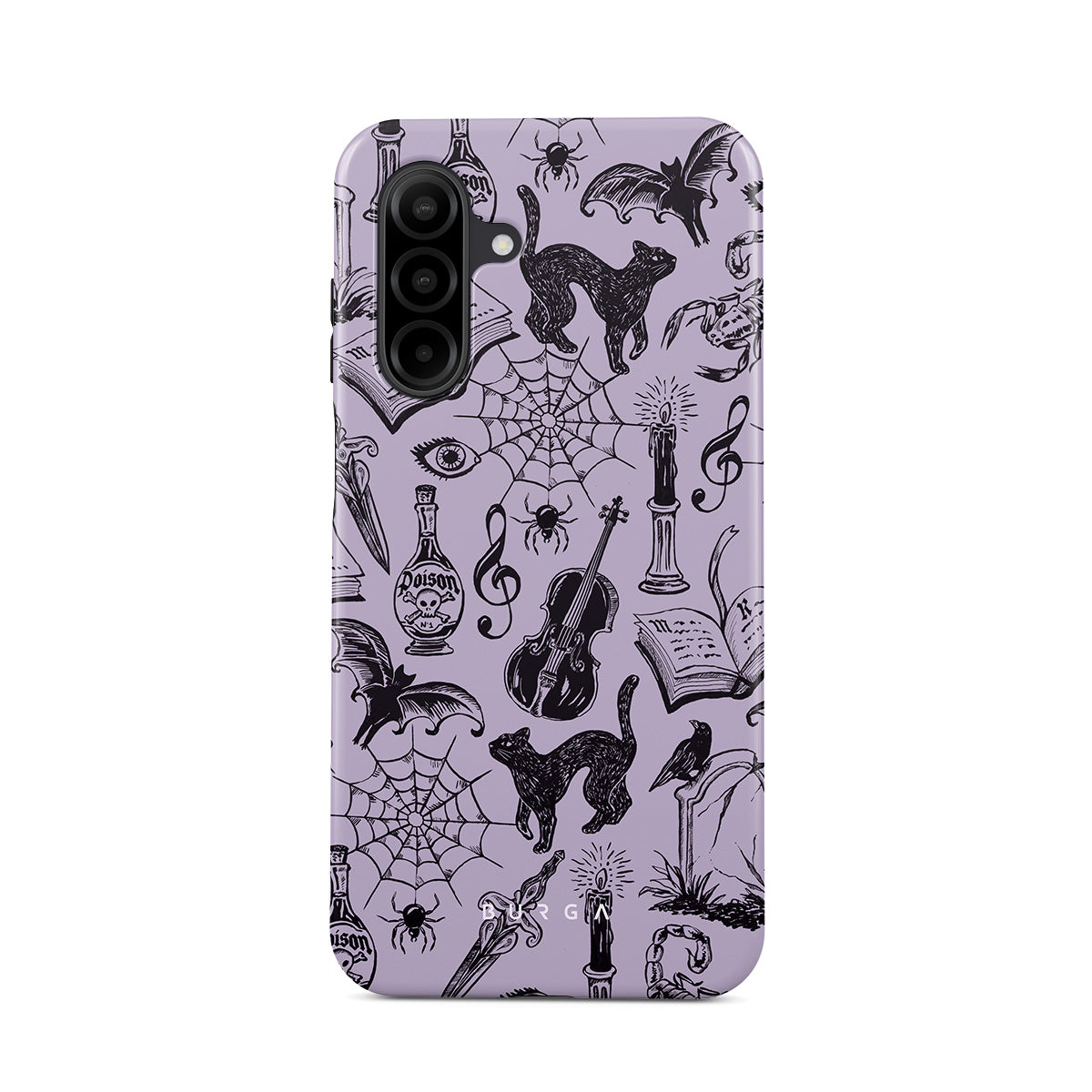 This design features: gothic doodles, mystical elements, spiders, spiderweb, cat, violin, eye, candle, dagger, book, bat, crow, scorpion