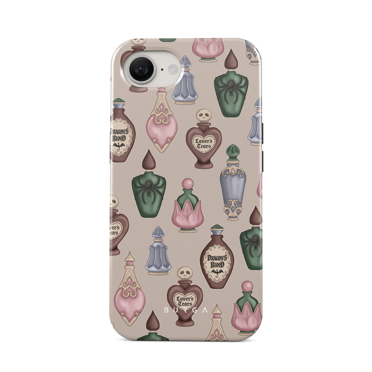 This design features: mystical potion bottles