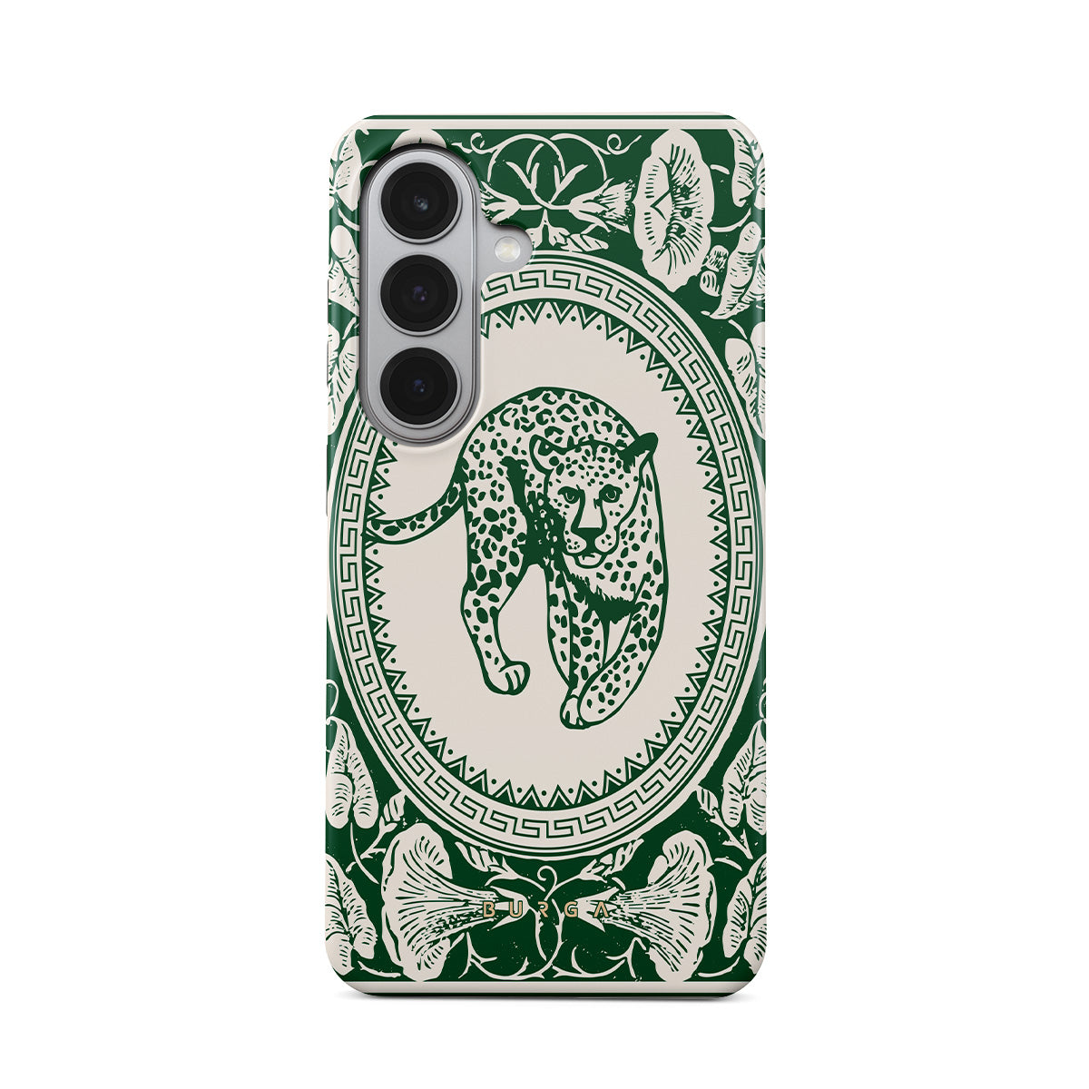 Our Antique Samsung Galaxy S26 Plus phone case design—a nude canvas kissed by refined green contours, painting an eternal saga of elegance. Enthroned at its center is a regal leopard embraced by a tender floral caress. A nod to timeless opulence, this design captures the essence of vintage prestige.