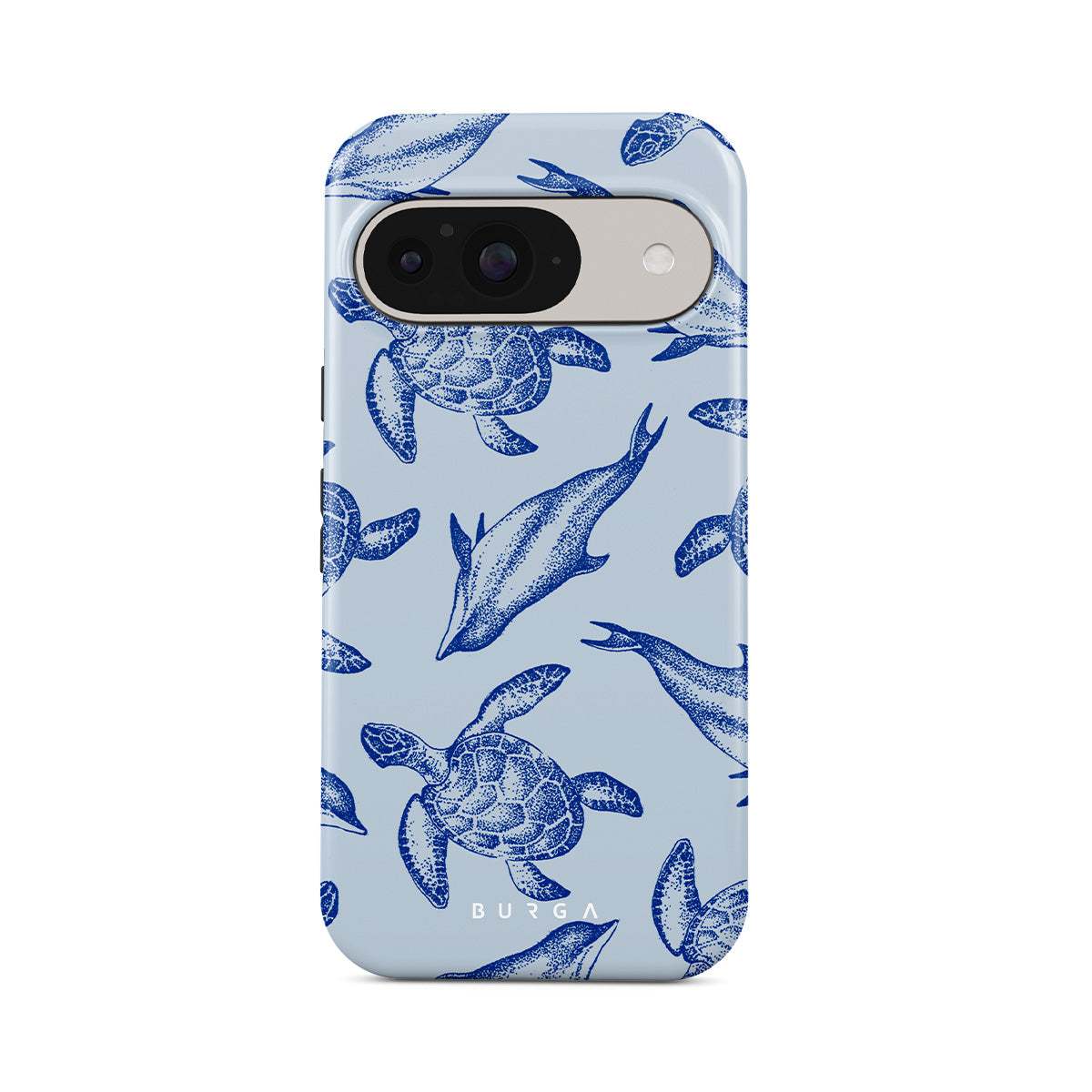 A beautiful design featuring lively turtles and dolphins playfully dancing in serene light blue water. Dive into the ocean's rhythm with our Aquatic Dance Google Pixel 10 Pro XL case.
