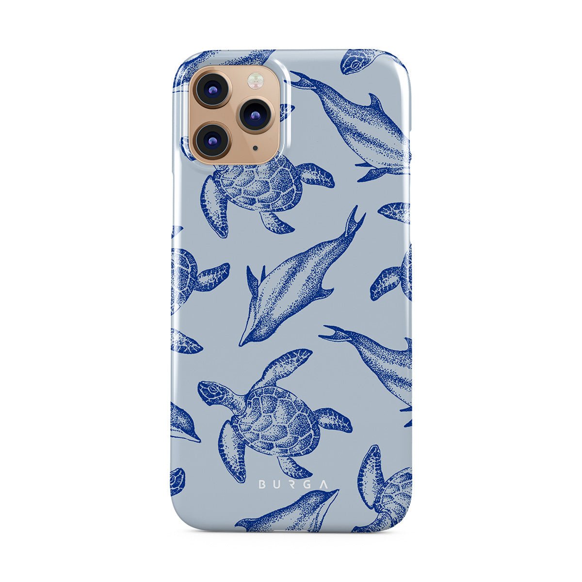 A beautiful design featuring lively turtles and dolphins playfully dancing in serene light blue water. Dive into the ocean's rhythm with our Aquatic Dance iPhone 11 Pro case.