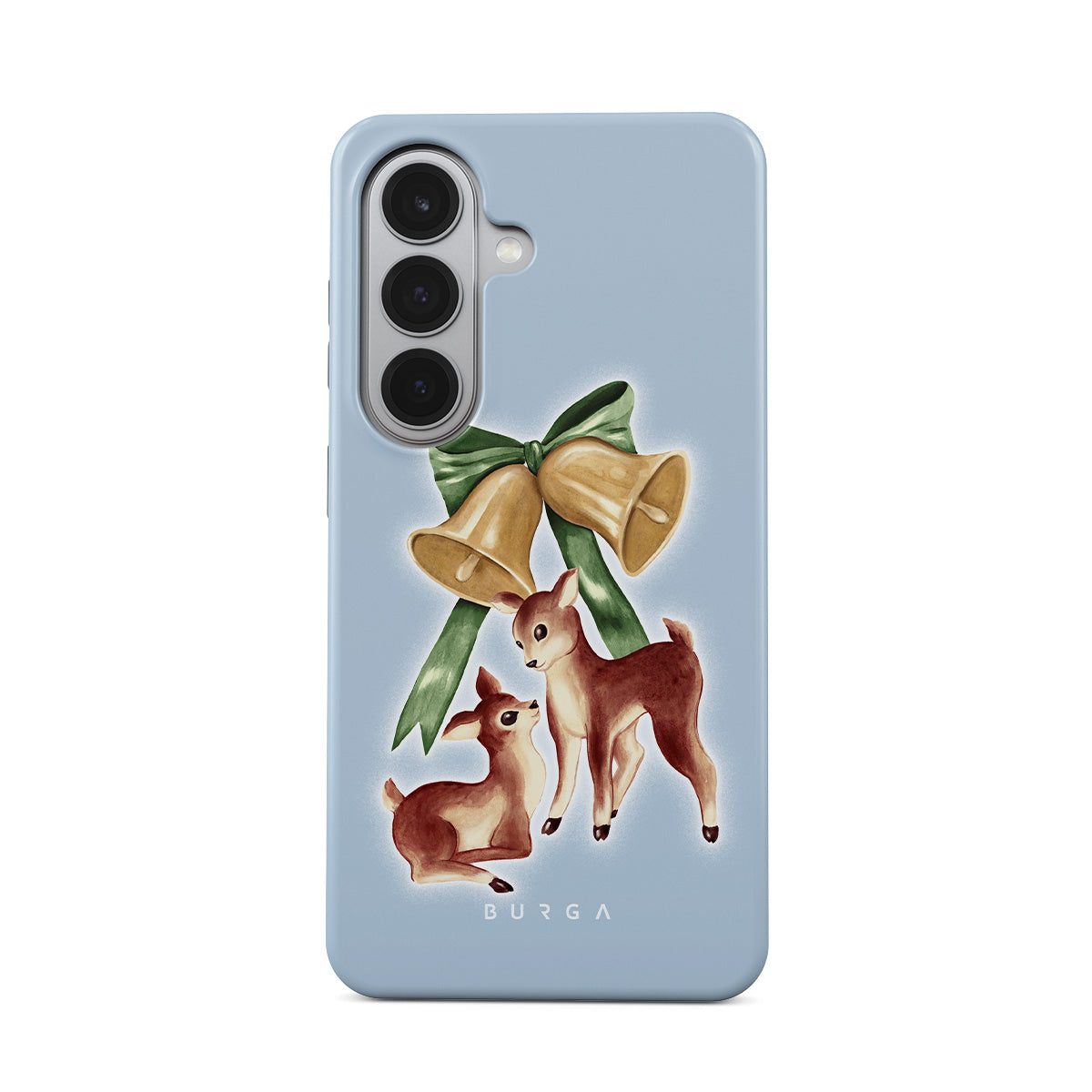 This design features: vintage reindeer, Christmas bells, golden bells, retro reindeer illustration, baby deer, light blue background
