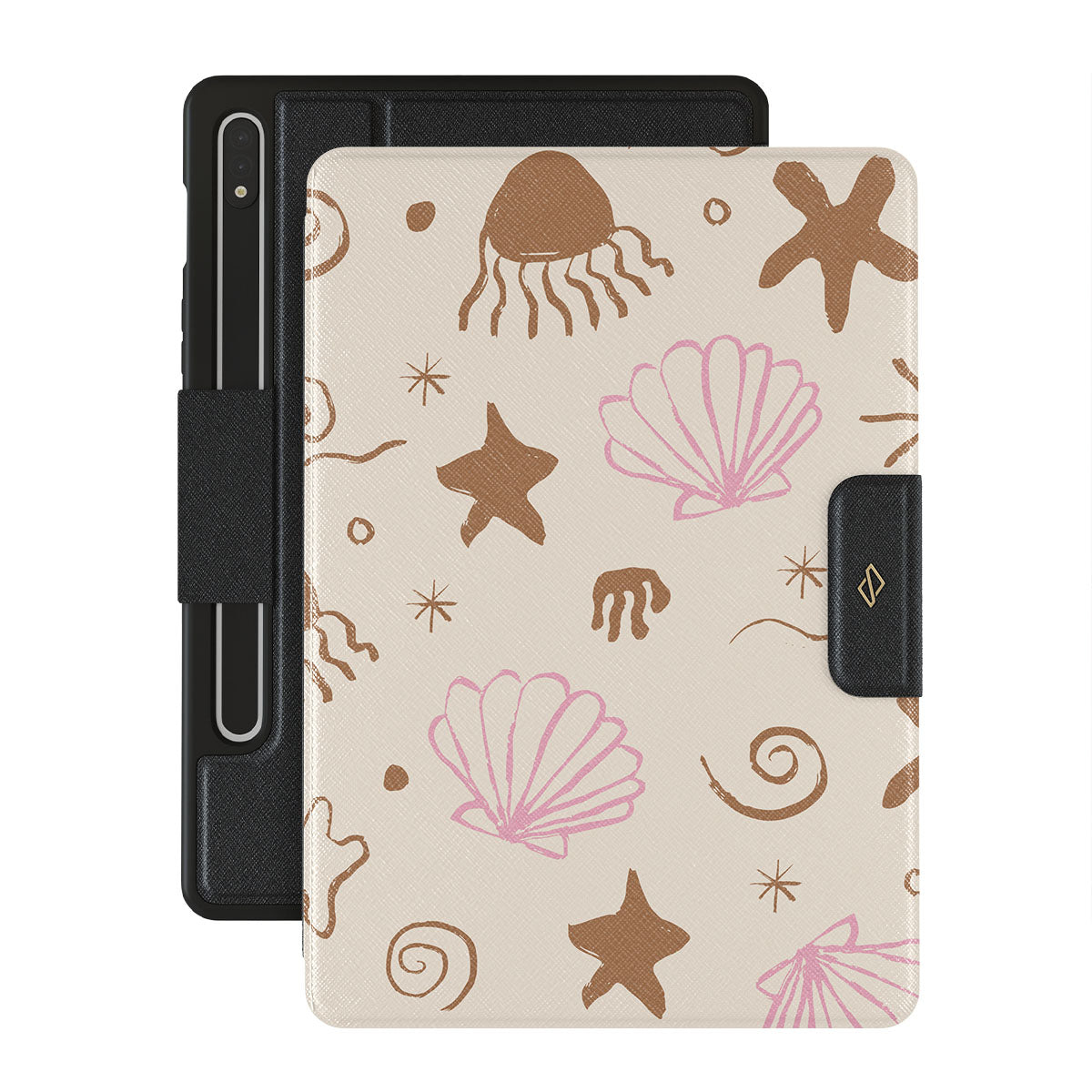 Our Beach Games Samsung Galaxy Tab S9 FE folio case features a delightful design inspired by seaside treasures, including cute starfish, pink seashells, and playful wave patterns on a sandy background. This beach-themed pattern captures the essence of a fun day at the shore, evoking the joy of discovering beautiful ocean gems.