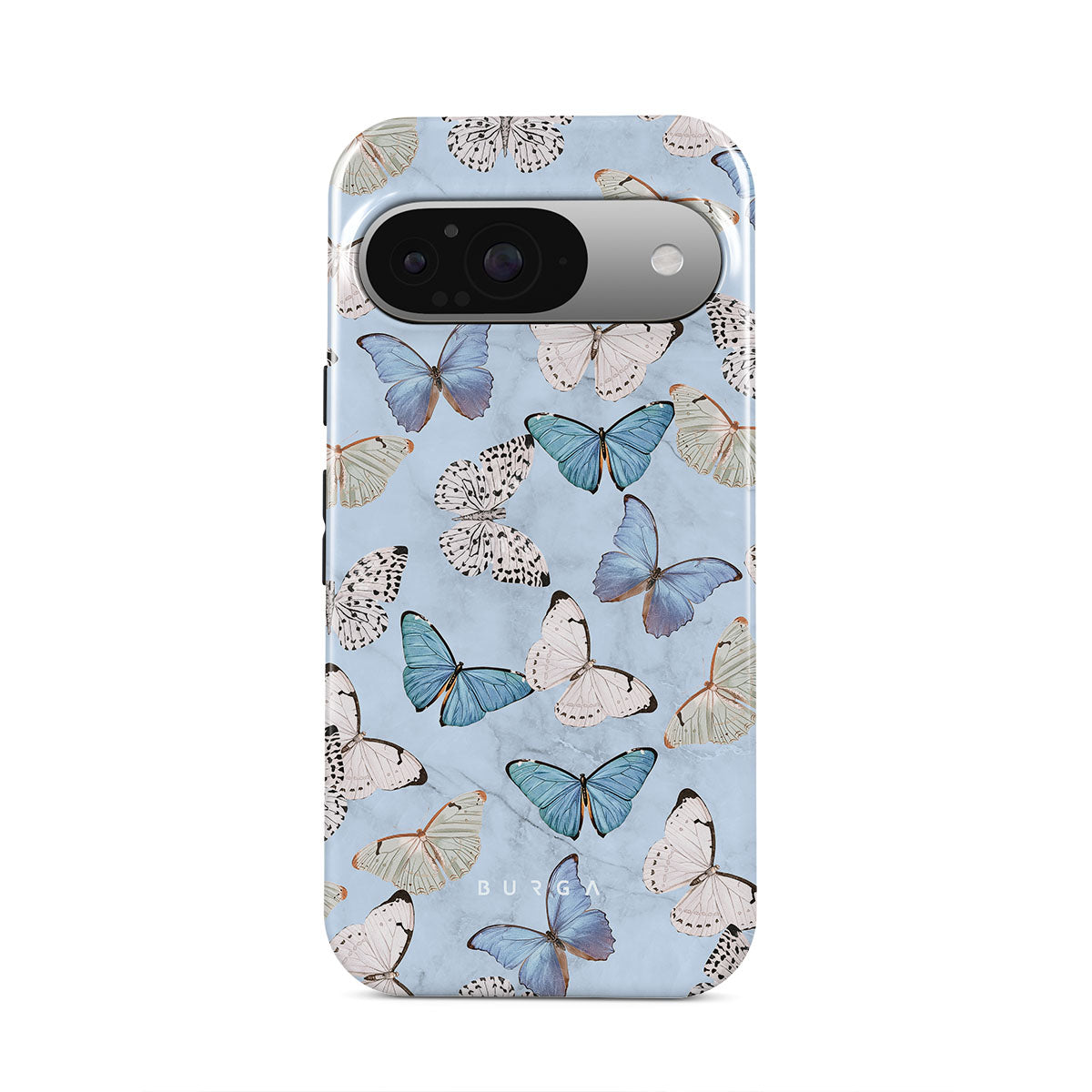 Pastel blue and a playful pattern of summery butterflies create a dreamy combination in our Google Pixel 9 phone case. Carry the feeling of the butterflies in your stomach while protecting your phone from any dangers, as the hard-shell case will keep it sound and safe.