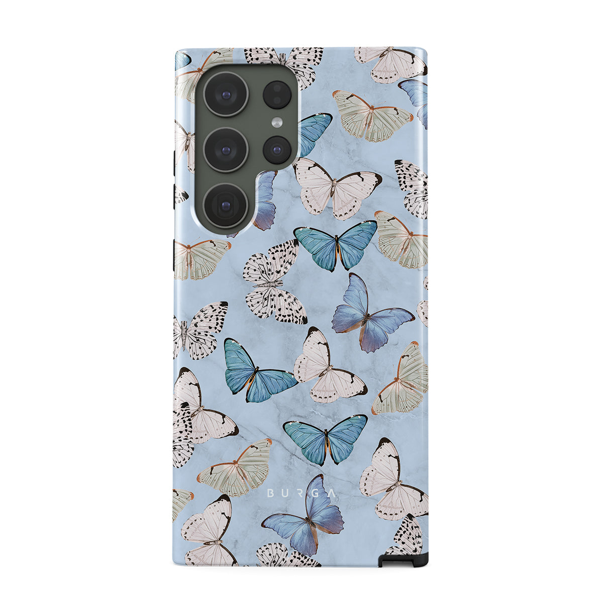 Pastel blue and a playful pattern of summery butterflies create a dreamy combination in our Samsung Galaxy S23 Ultra phone case. Carry the feeling of the butterflies in your stomach while protecting your phone from any dangers, as the hard-shell case will keep it sound and safe.