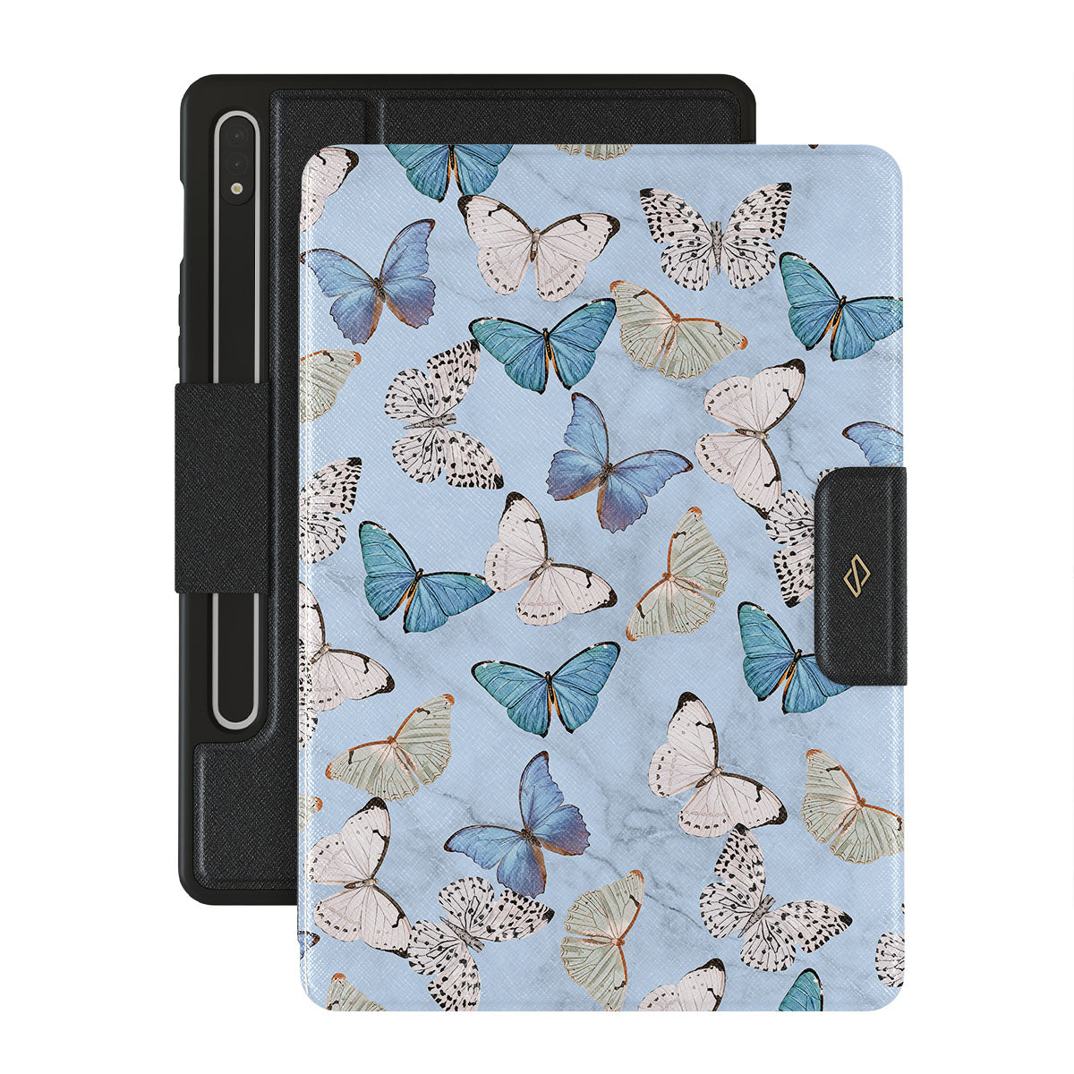 Pastel blue and a playful pattern of summery butterflies create a dreamy combination in our Samsung Galaxy Tab S8/S7 folio case. Carry the feeling of the butterflies in your stomach while protecting your Galaxy Tab from any dangers, as the hard-shell case will keep it sound and safe.