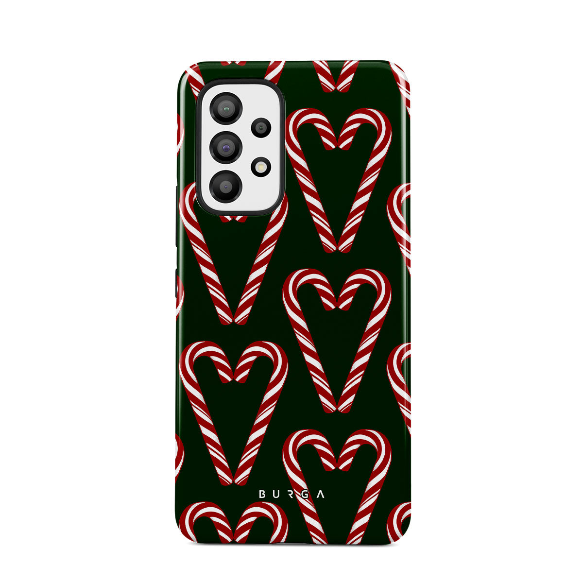 Vibrant and playful, our Candy Cane Samsung Galaxy A23 4G / 5G Case phone case design showcases candy cane heart motifs against a dark green background—a delightful choice for those who love a touch of whimsy and nostalgia.