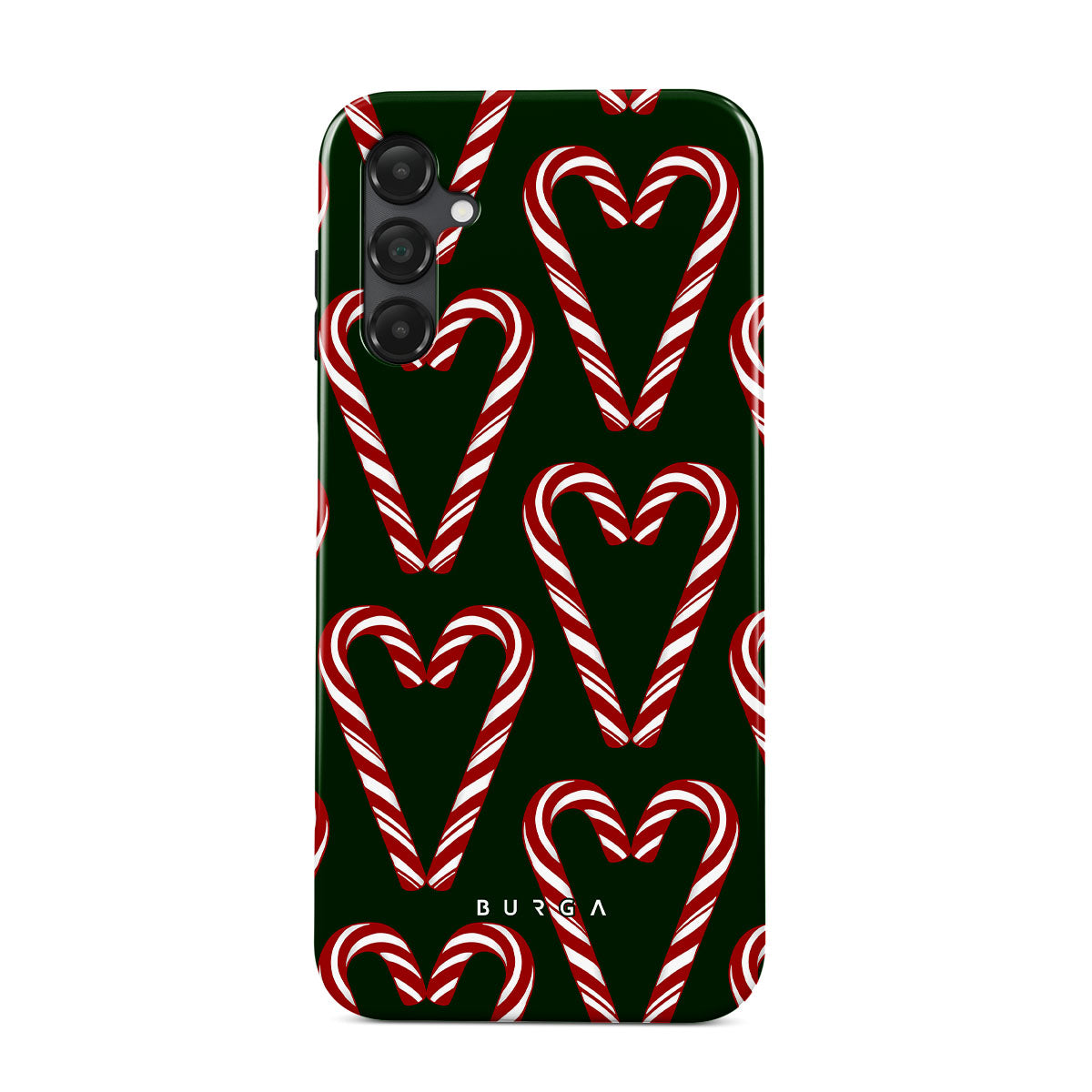 Vibrant and playful, our Candy Cane Samsung Galaxy A25 Case phone case design showcases candy cane heart motifs against a dark green background—a delightful choice for those who love a touch of whimsy and nostalgia.