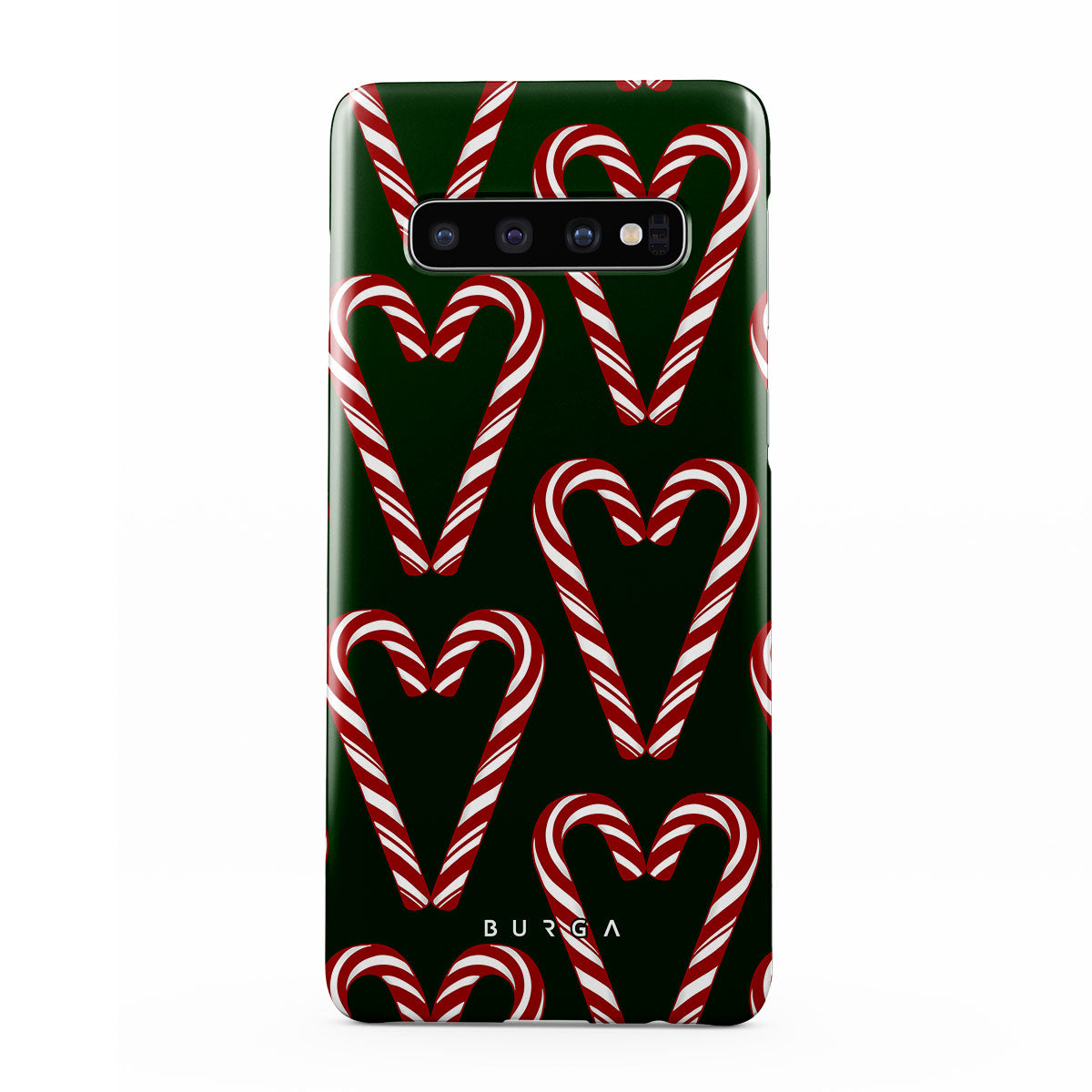 Vibrant and playful, our Candy Cane Samsung Galaxy S10 Plus Case phone case design showcases candy cane heart motifs against a dark green background—a delightful choice for those who love a touch of whimsy and nostalgia.