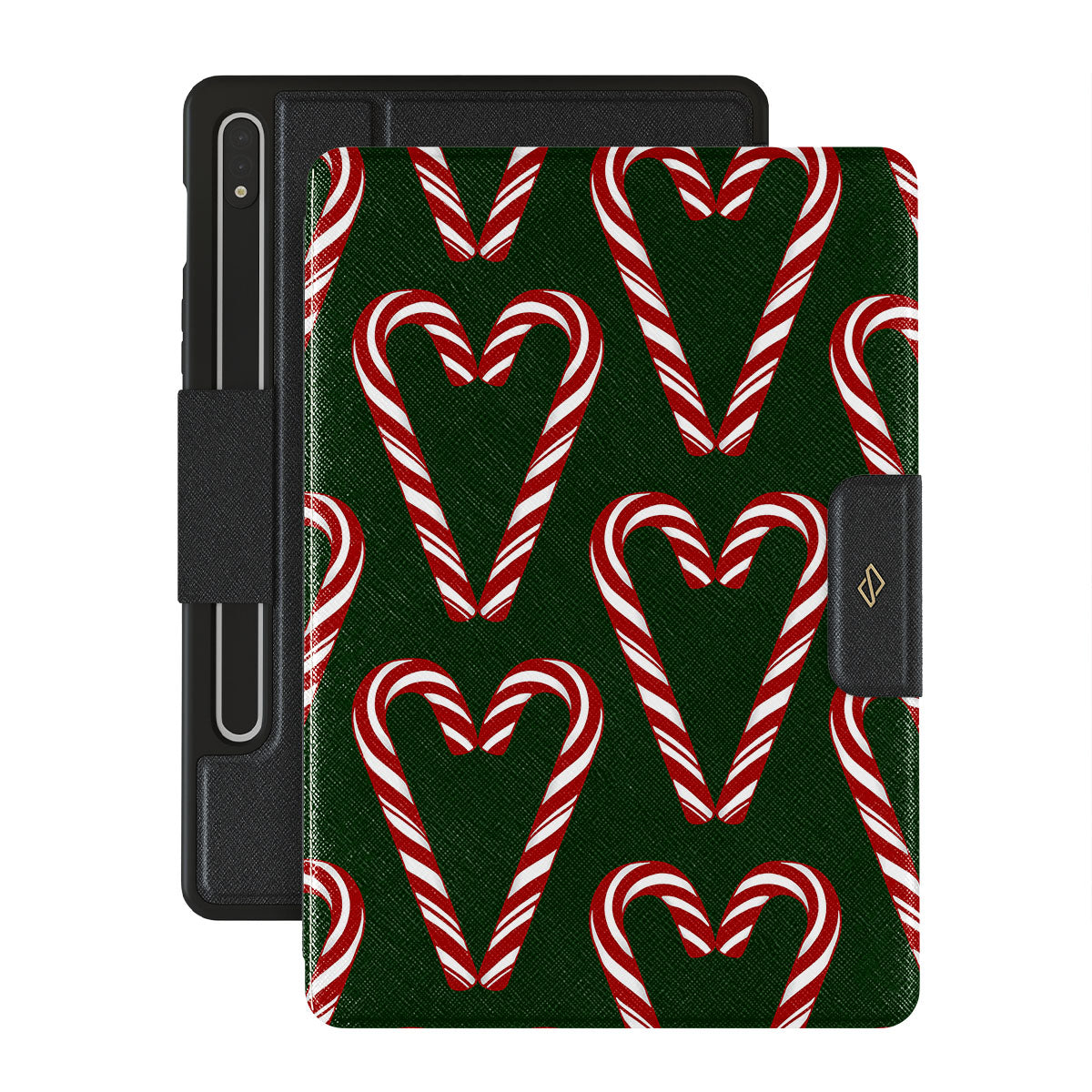 Vibrant and playful, our Candy Cane Samsung Galaxy Tab S8/S7 folio case design showcases candy cane heart motifs against a dark green background—a delightful choice for those who love a touch of whimsy and nostalgia.