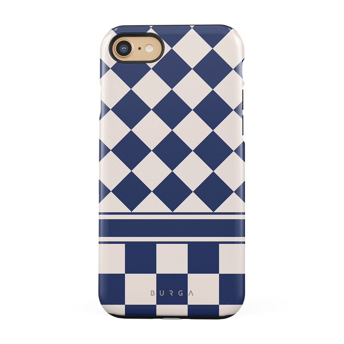 Embrace the essence of subtle luxury with our Check & Mate iPhone 7 / iPhone 8 phone case design. Blending eggshell and deep blue checkers, it evokes whispers of elegance. While diamonds grace the upper half, the lower half features a timeless chessboard pattern.
