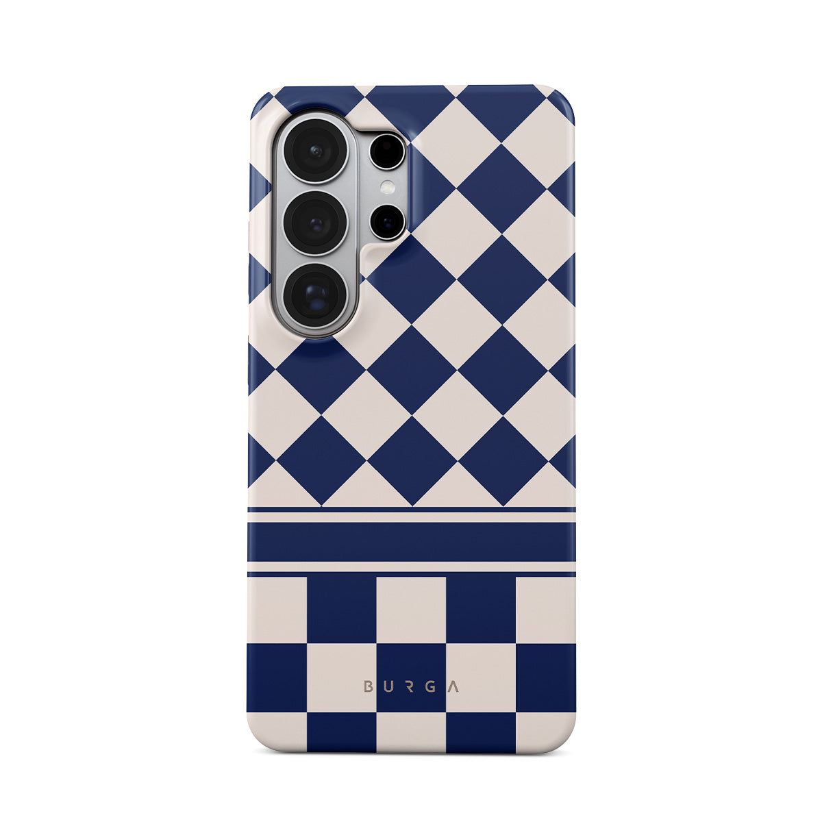 Embrace the essence of subtle luxury with our Check & Mate Samsung Galaxy S26 Ultra phone case design. Blending eggshell and deep blue checkers, it evokes whispers of elegance. While diamonds grace the upper half, the lower half features a timeless chessboard pattern.