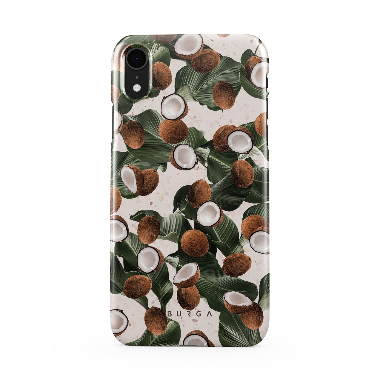 Coconut Crush iPhone XR phone case showcases a soft creme color design with a playful addition of coconuts on top. The unexpected design duo will add a touch of tropical playfulness to your style while offering heavy-duty protection for your cell phone.