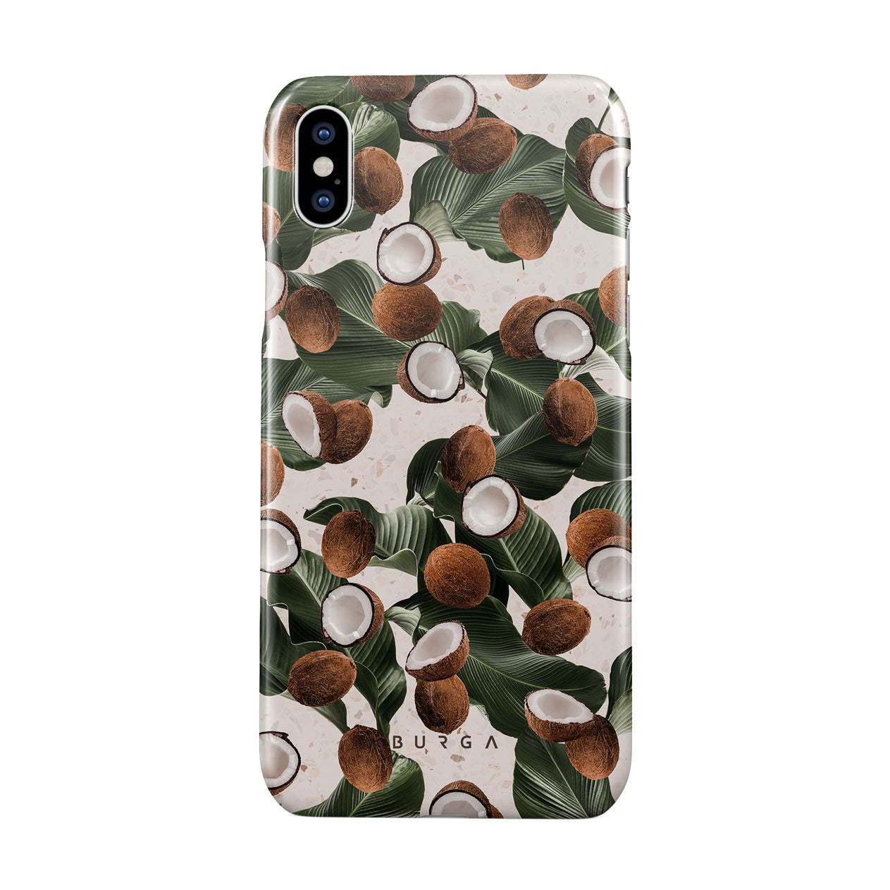 Coconut Crush iPhone XS Max phone case showcases a soft creme color design with a playful addition of coconuts on top. The unexpected design duo will add a touch of tropical playfulness to your style while offering heavy-duty protection for your cell phone.