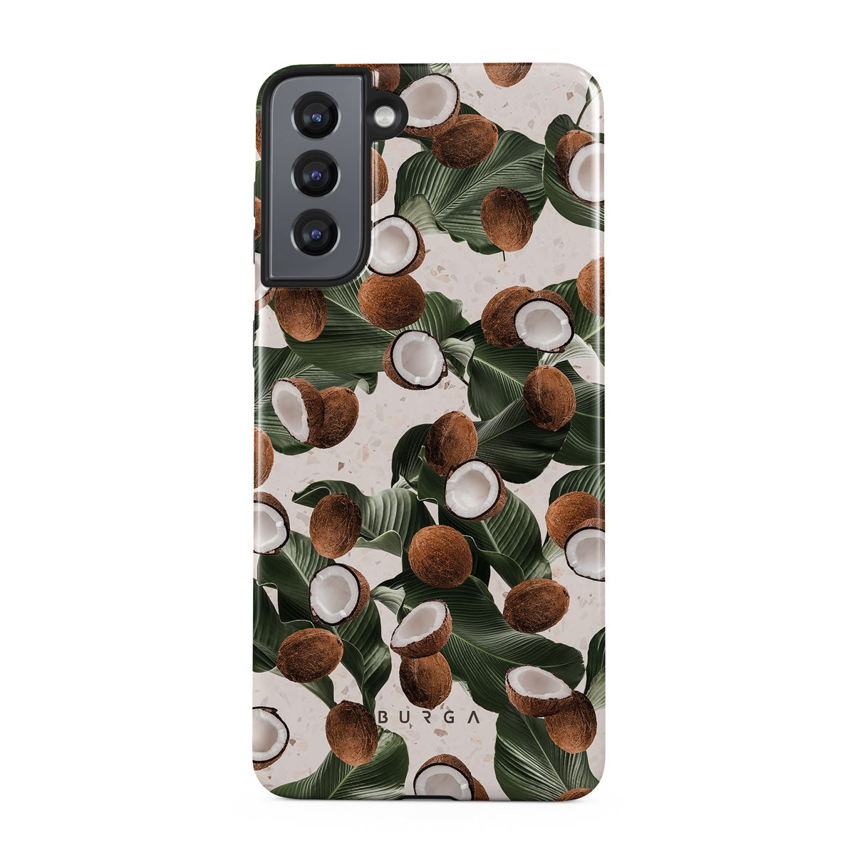 Coconut Crush Samsung Galaxy S21 phone case showcases a soft creme color design with a playful addition of coconuts on top. The unexpected design duo will add a touch of tropical playfulness to your style while offering heavy-duty protection for your cell phone.