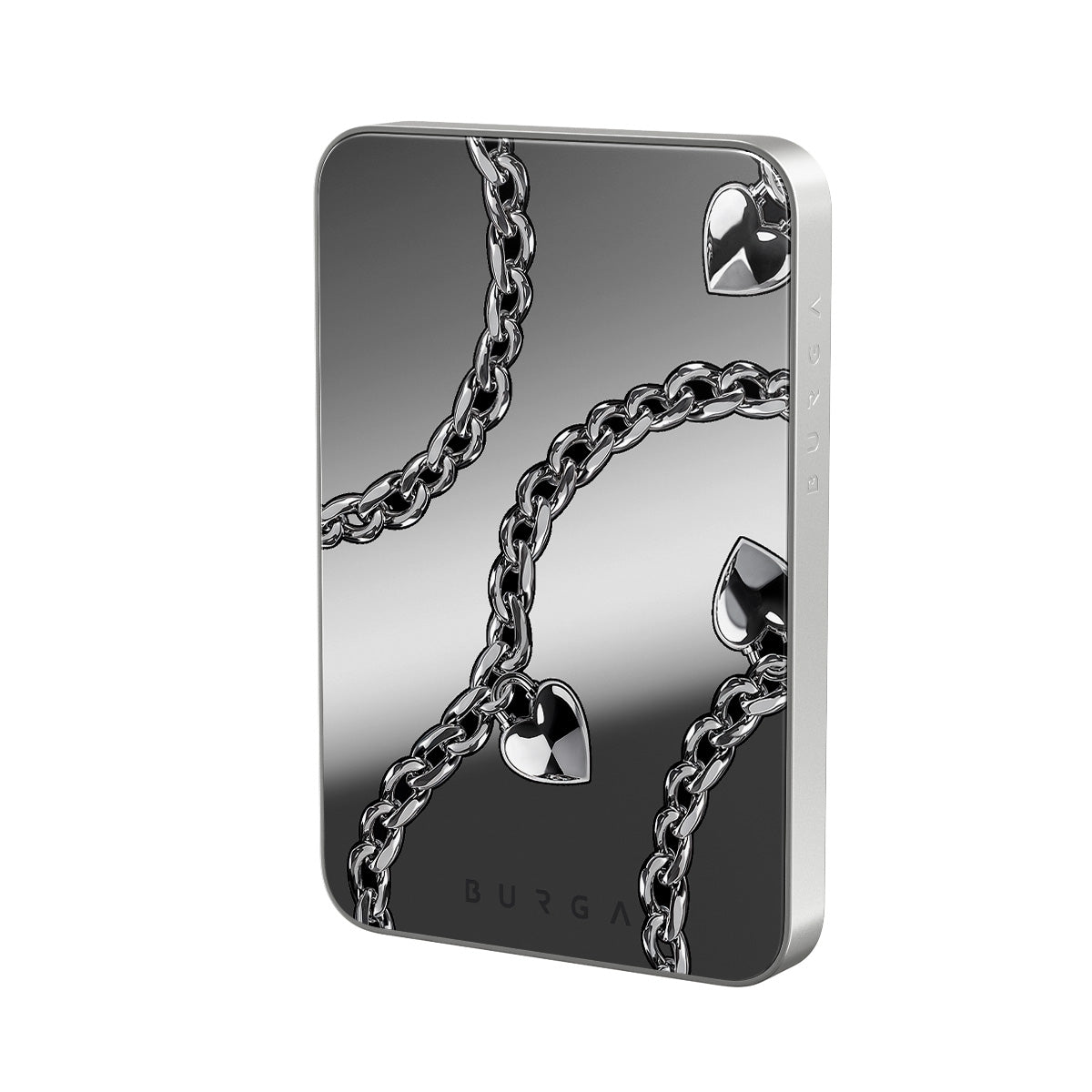 This design features: chains, hearts, silver, metallic details, mirror