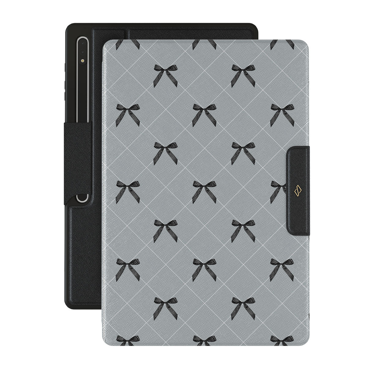 A subtle hint to a world of dance and soft melodies. Crisscrossing bows over a muted gray tone capture the flirtatious essence of the coquette-core aesthetic. Playful and sweet, our Coquette Samsung Galaxy Tab S10 Ultra folio case design is perfect for those who find beauty in the details.
