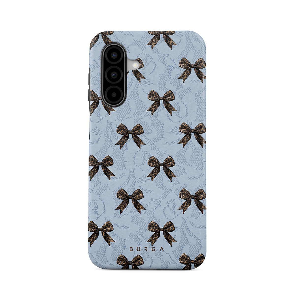 For those who command attention with subtle elegance, our Fashionista Samsung Galaxy A17 phone case design is your go-to. A soft blue background, accented by dark grey bows and subtle lace patterns, exudes polished, effortless style. It's quiet confidence with a hint of charm.
