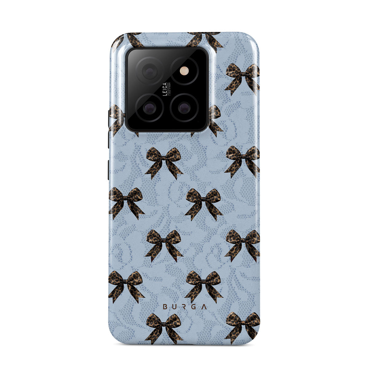 For those who command attention with subtle elegance, our Fashionista Xiaomi 14 phone case design is your go-to. A soft blue background, accented by dark grey bows and subtle lace patterns, exudes polished, effortless style. It's quiet confidence with a hint of charm.