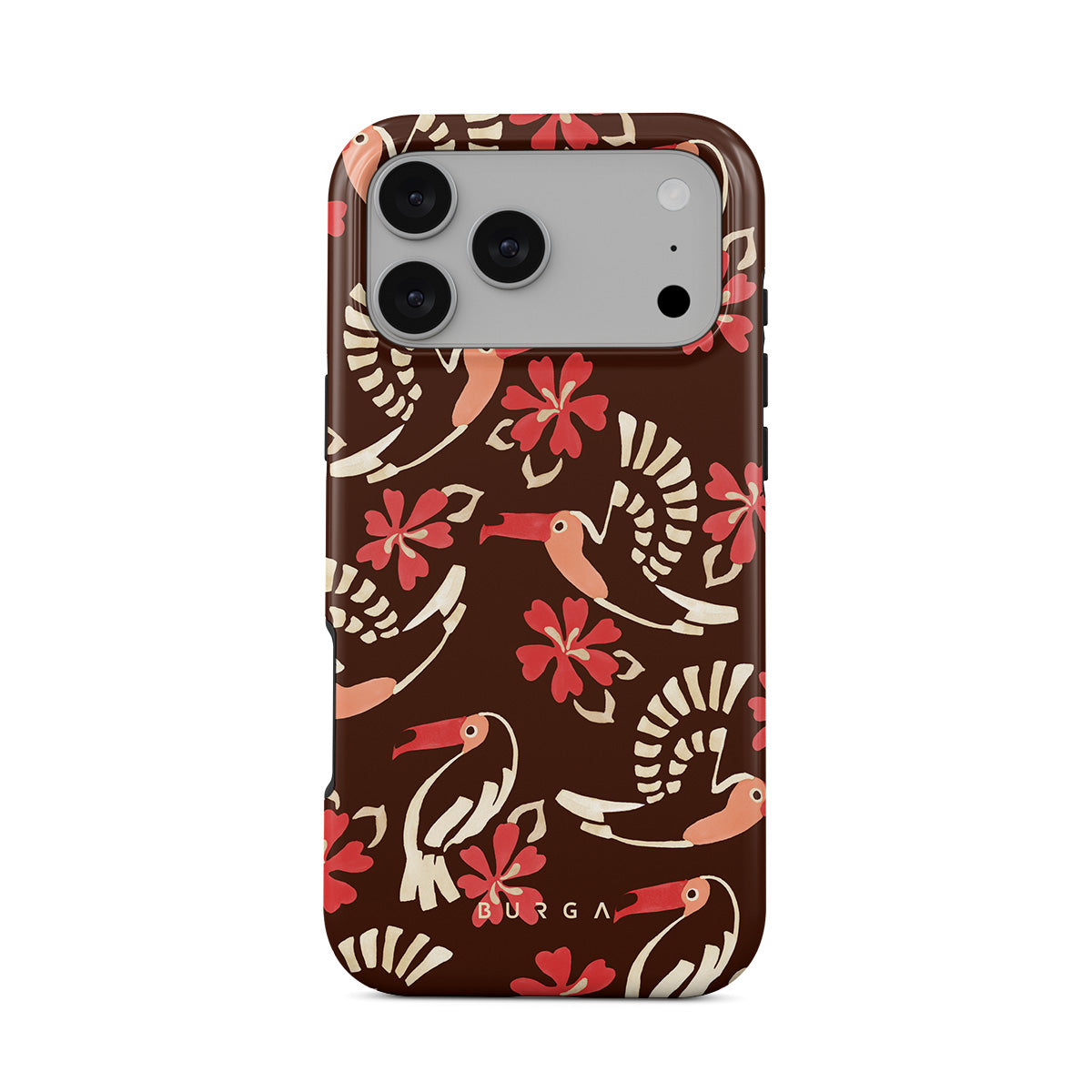 A jungle rave. Parrots, florals, bursts of red and cream—like someone threw a party in the rainforest and forgot to send you the invite. This iPhone 17 Pro Max phone case design is your RSVP.