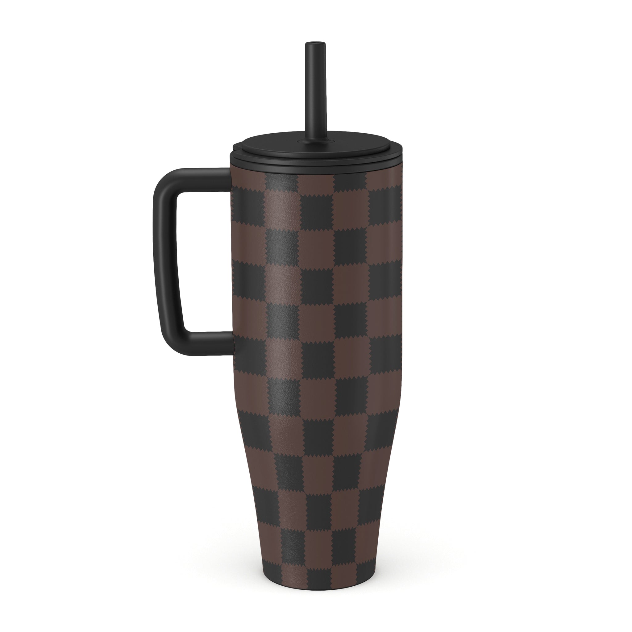 This design features: checkered pattern, brown and dark tones, geometric