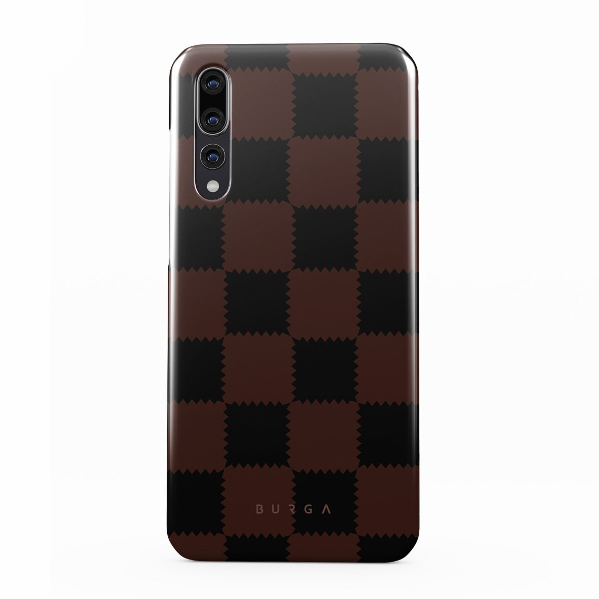 This design features: checkered pattern, brown and dark tones, geometric