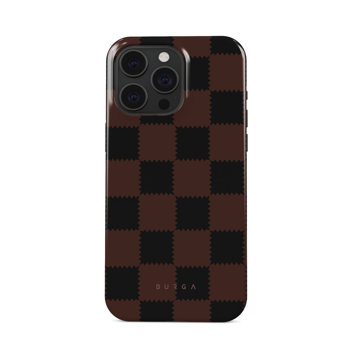 This design features: checkered pattern, brown and dark tones, geometric