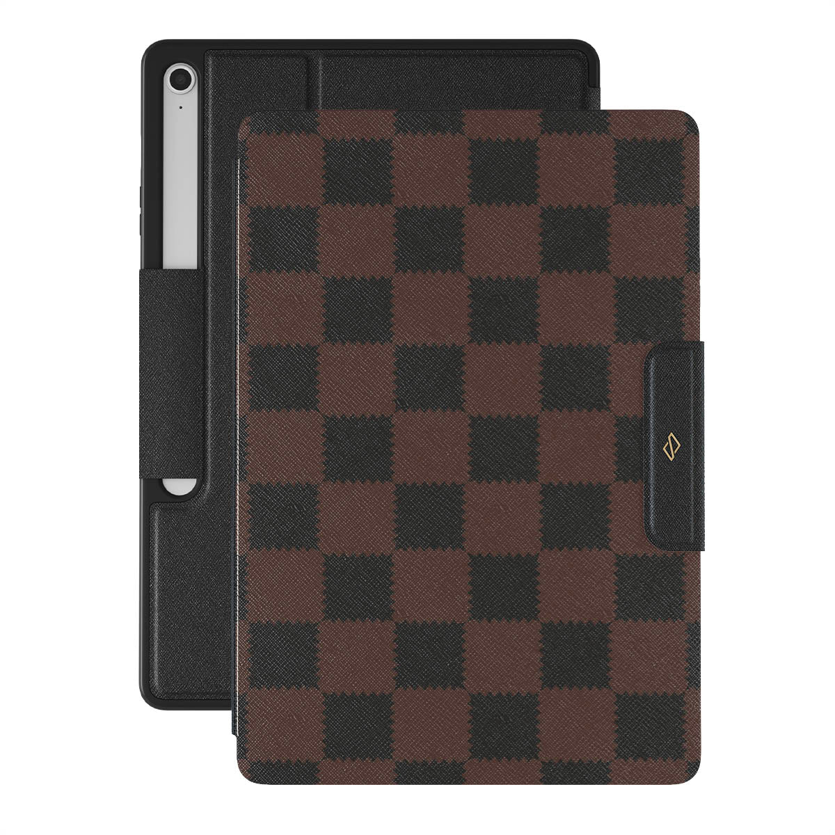 This design features: checkered pattern, brown and dark tones, geometric
