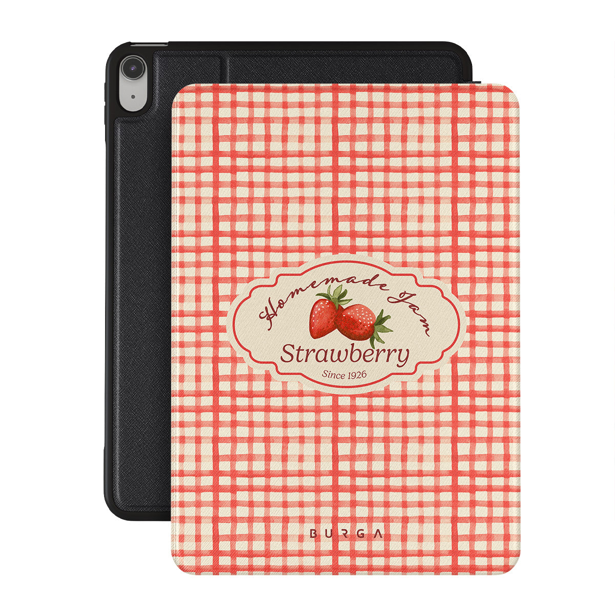This design features: strawberries, gingham checks, jam label illustrations, vintage food graphic