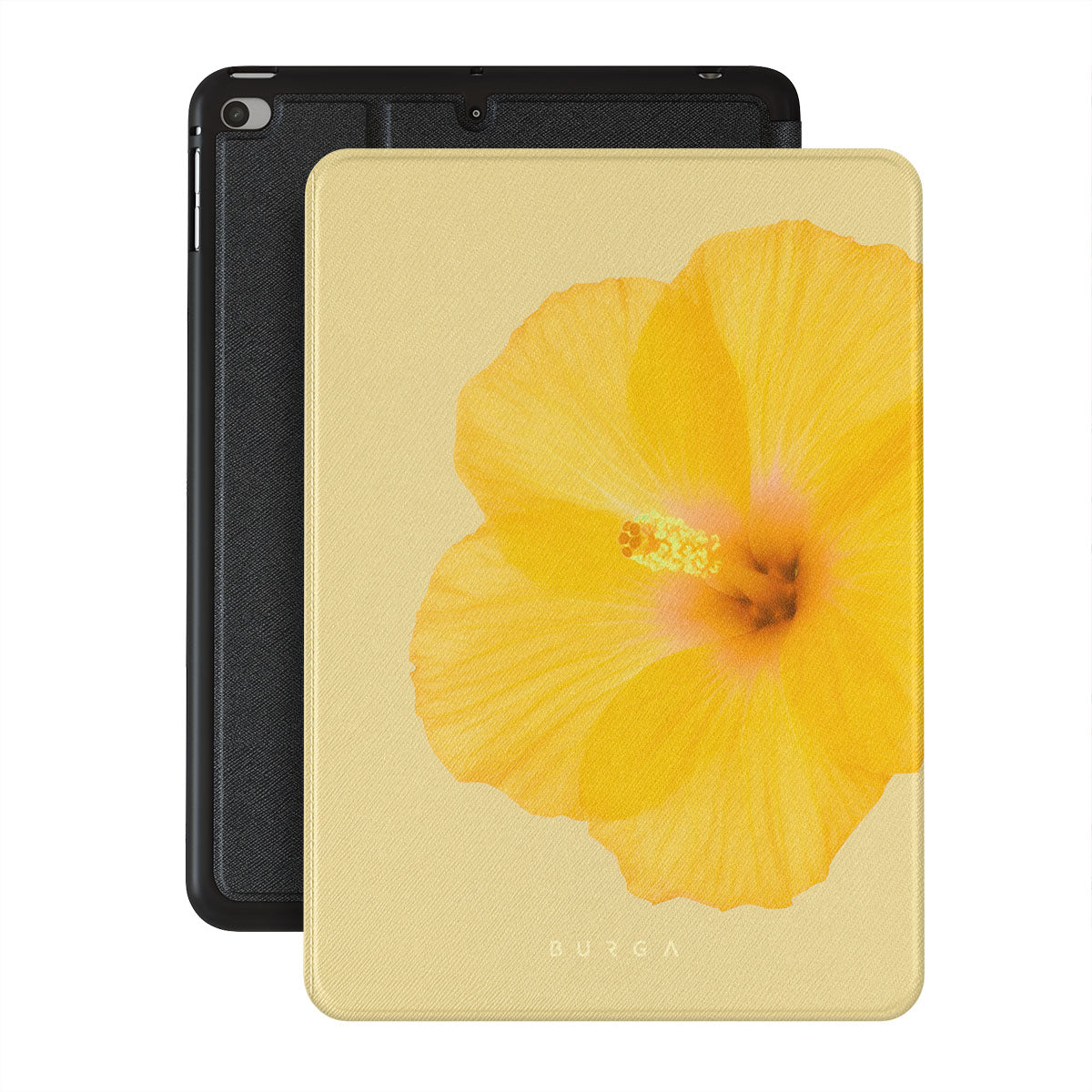 Our Hibiscus iPad Mini 7.9 (5th Gen) folio case features a striking design with a large, vibrant yellow hibiscus flower on a matching yellow background. This tropical flower pattern exudes a sense of warmth and exotic beauty, perfect for those who love nature-inspired and floral aesthetics.