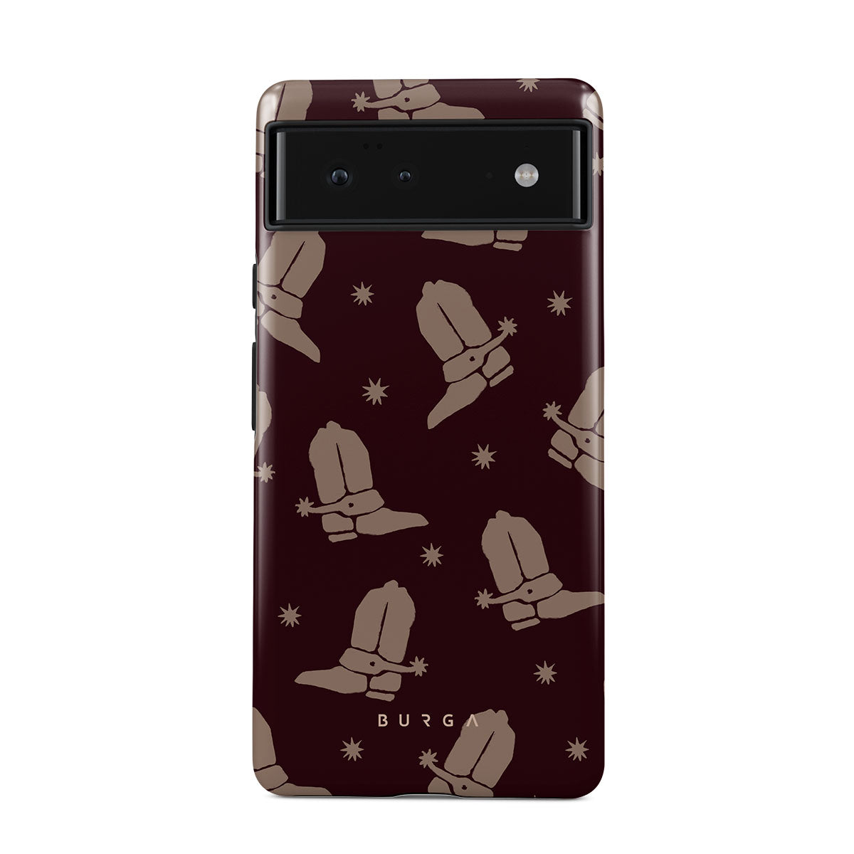 Say Howdy to this charming Google Pixel 6 phone case design. Cowboy boots and stars dance across a deep brown background, celebrating the essence of western life. Perfect for those who embrace their free spirit.