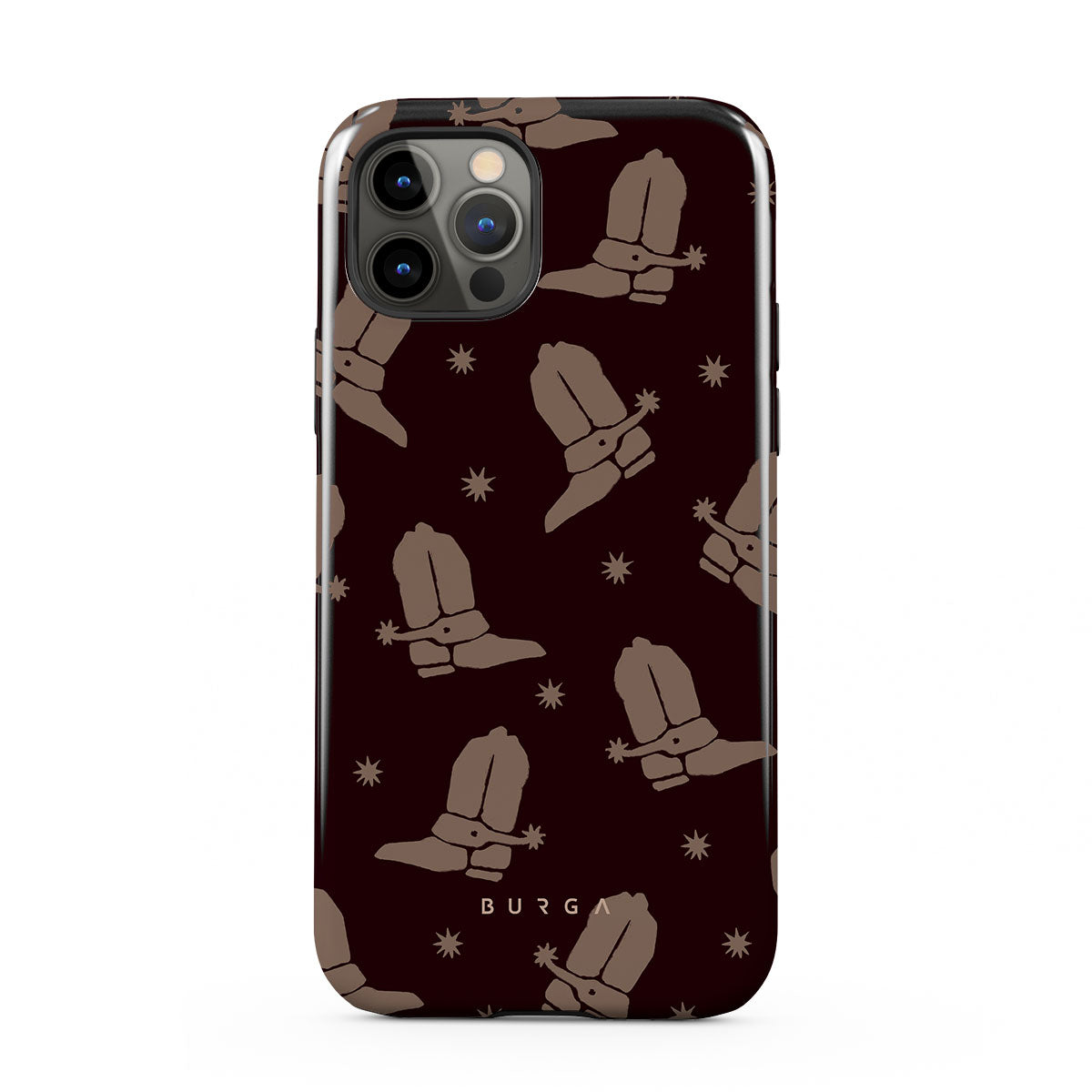 Say Howdy to this charming iPhone 12 Pro phone case design. Cowboy boots and stars dance across a deep brown background, celebrating the essence of western life. Perfect for those who embrace their free spirit.