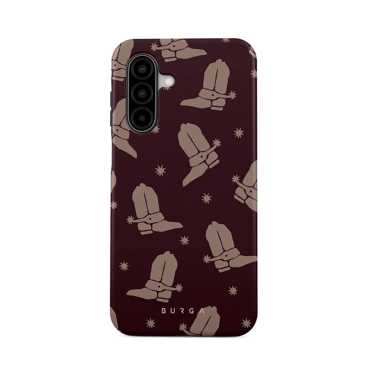 Say Howdy to this charming Samsung Galaxy A17 phone case design. Cowboy boots and stars dance across a deep brown background, celebrating the essence of western life. Perfect for those who embrace their free spirit.