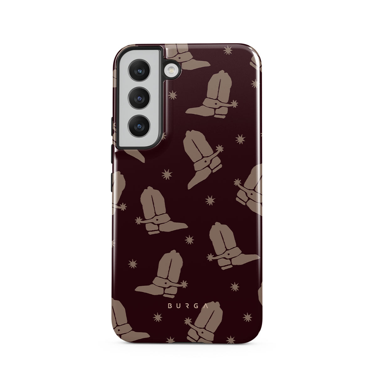 Say Howdy to this charming Samsung Galaxy S22 phone case design. Cowboy boots and stars dance across a deep brown background, celebrating the essence of western life. Perfect for those who embrace their free spirit.