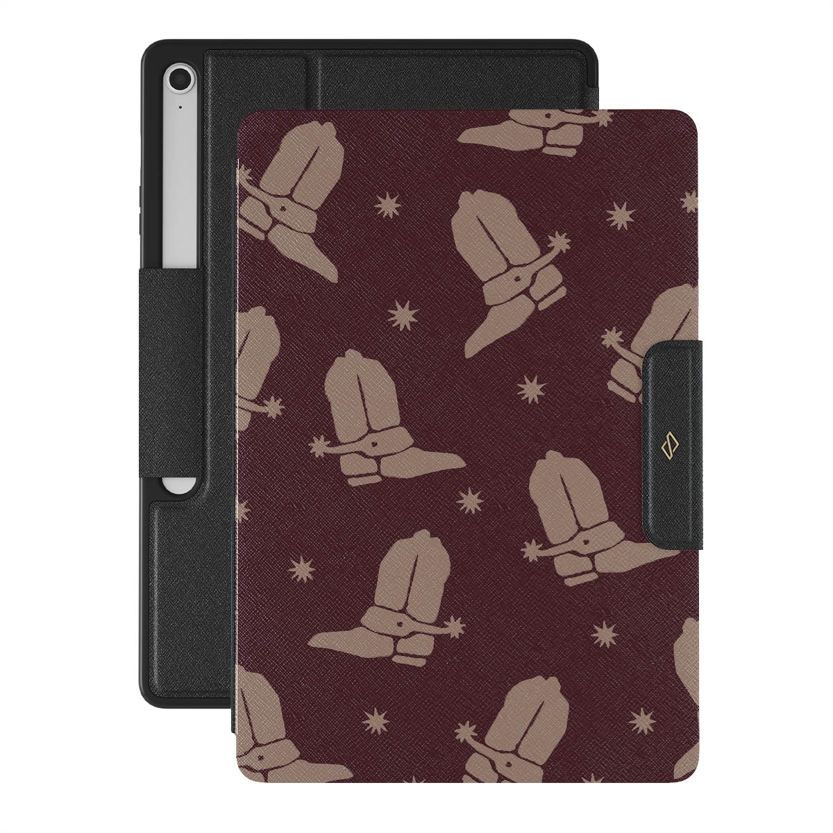 Say Howdy to this charming Samsung Galaxy Tab S10+ FE folio case design. Cowboy boots and stars dance across a deep brown background, celebrating the essence of western life. Perfect for those who embrace their free spirit.
