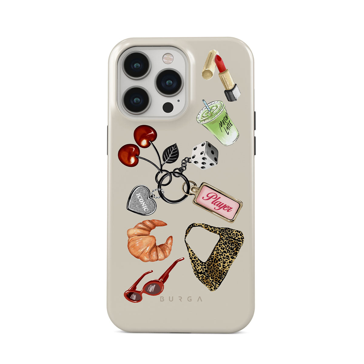 This design features: red sunglasses, red lipstick, green matcha drink, croissant, black dice, leopard-print bag, keychain with silver heart, cherries, dice and "Player" tag