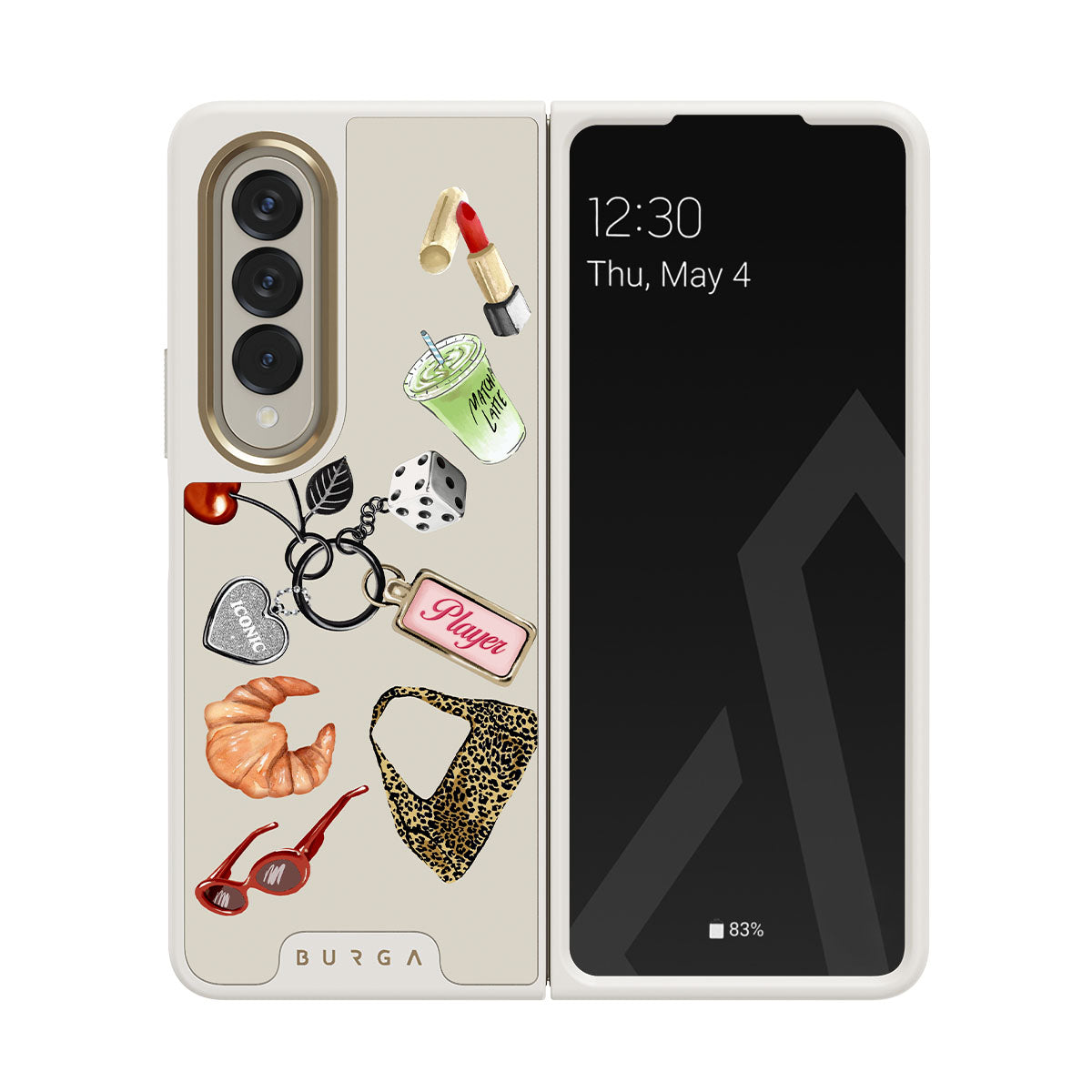 This design features: red sunglasses, red lipstick, green matcha drink, croissant, black dice, leopard-print bag, keychain with silver heart, cherries, dice and "Player" tag