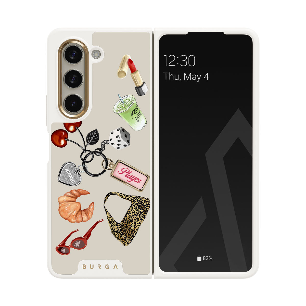 This design features: red sunglasses, red lipstick, green matcha drink, croissant, black dice, leopard-print bag, keychain with silver heart, cherries, dice and "Player" tag