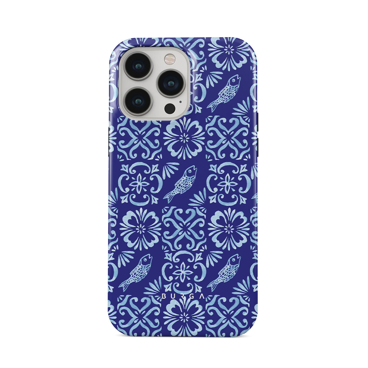 This design features: Portuguese tile patterns, deep blues, floral patterns, flowers, fish