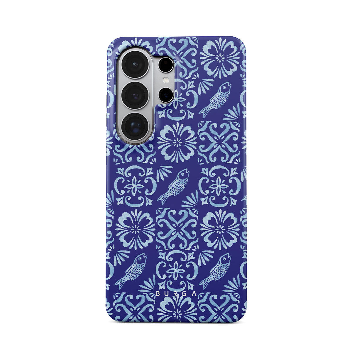 This design features: Portuguese tile patterns, deep blues, floral patterns, flowers, fish