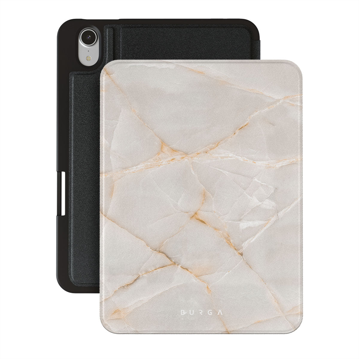 The Vanilla Sand Marble iPad Mini 8.3 (A17 Pro/6th Gen) 2021 folio case cover features a marble design with creamy canvas showcasing beautiful golden hues. The soft-toned case will add a touch of luxury to the device while protecting it from dangerous falls.