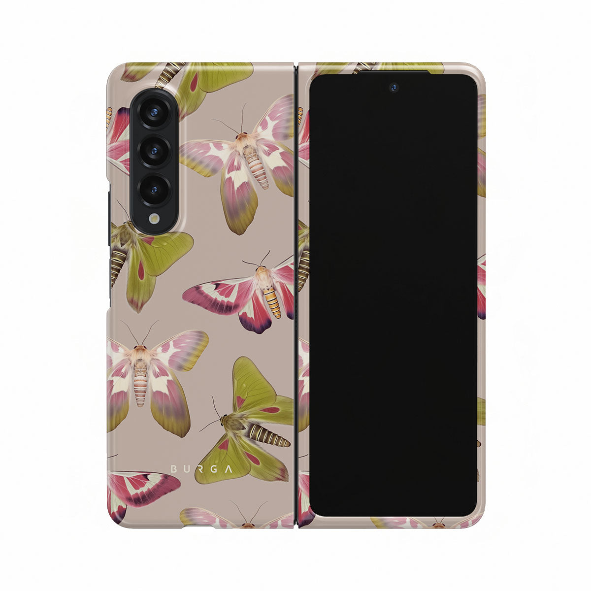 A tapestry of muted-toned moths — their wing patterns echoing tales of transformation and resilience found in nature's delicate beings. These moths, wings wide, serve as silent mentors, teaching us that every phase of life and change holds its own magic and mystery. Discover our Metamorphosis Samsung Galaxy Z Fold 3 phone casedesign.