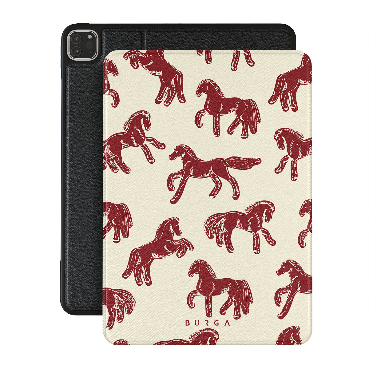 It's time to unleash your wild side with the Mustang design. Bold red horses gallop across a nude background, capturing the spirit of untamed adventure. This iPad Pro 12.9 (6th/5th Gen) folio case is perfect for the free-spirited souls ready to ride into the unknown.