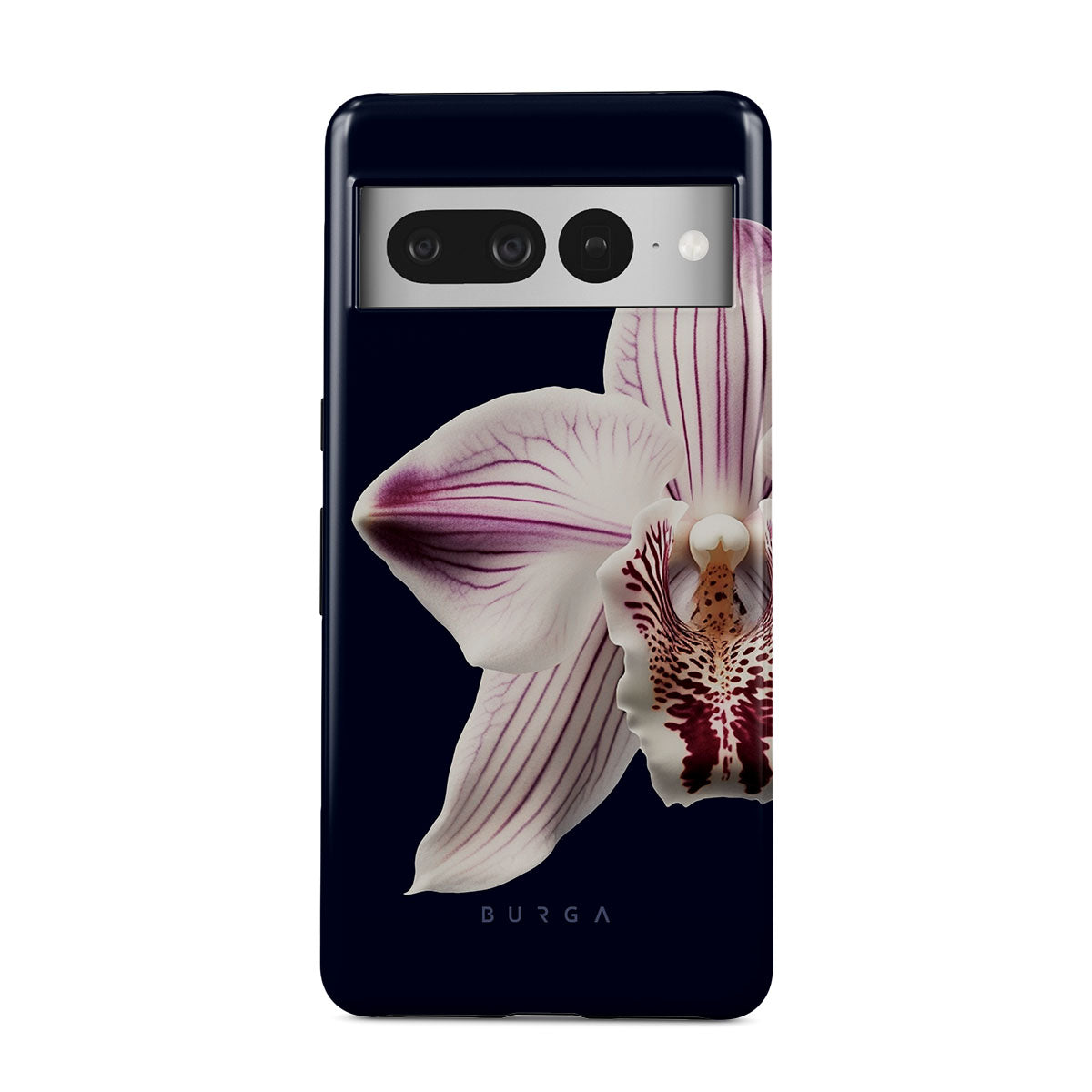 The white orchid blooms boldly upon a night sky blue, a beacon of clarity in the darkness. Our Nectar Google Pixel 7 Pro phone case design speaks to the soul's desire to find light within, to illuminate the hidden paths of self-discovery that only reveal themselves under the cloak of introspection.