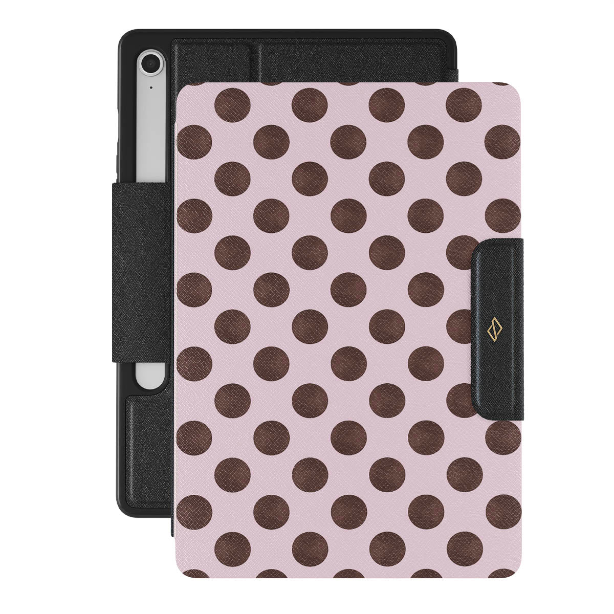 This design features: a retro polka dot pattern, pink background with brown polka dots.