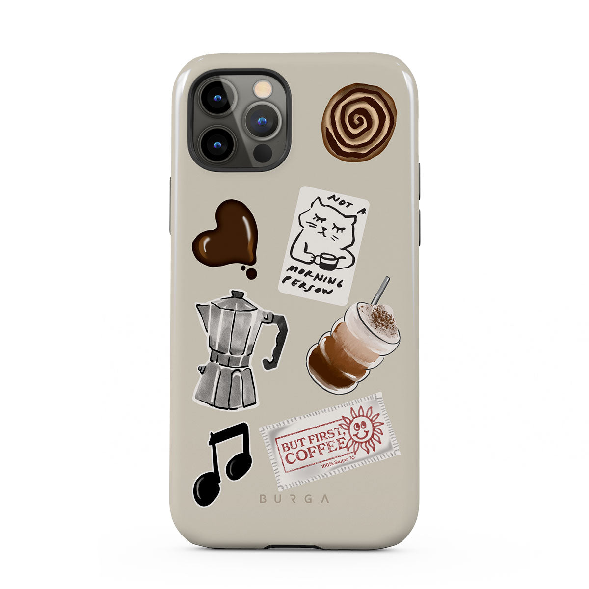 This design features: moka pot, frappe, cinnamon roll, chocolate heart, "Not a morning person" sticker, "But First, Coffee" receipt, music note