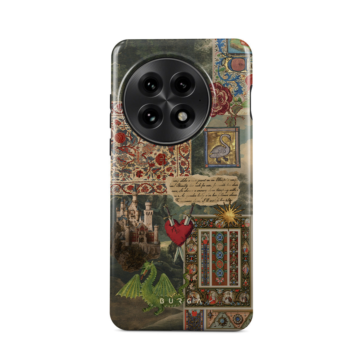 This design features: handwritten calligraphy font, vintage print, medieval design, floral pattern, old book illustrations, heart, dragon, castle