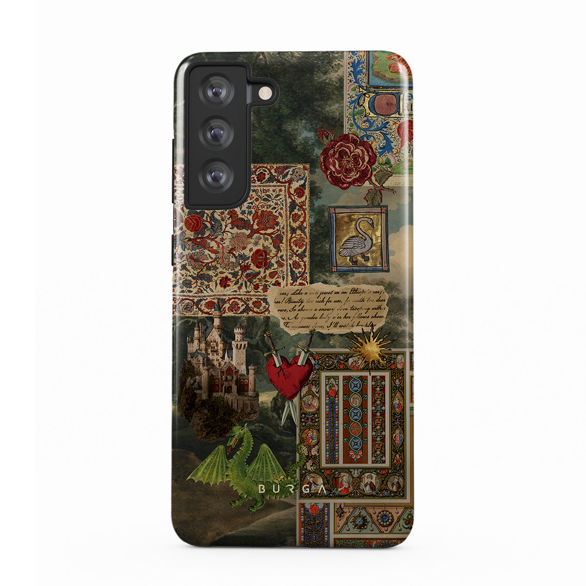 This design features: handwritten calligraphy font, vintage print, medieval design, floral pattern, old book illustrations, heart, dragon, castle